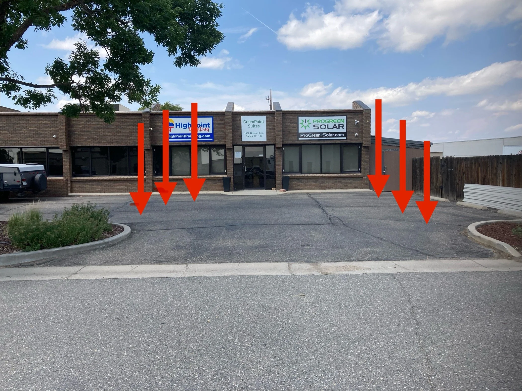 Please use one of the six parking spots and enter the GreenPoint Suites door (East side).